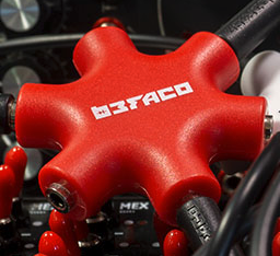 Genau diese Rolle nimmt in einem modularen Synthesizer ein gepufferter Multiplikator (buffered mult) ein. Seine Funktion besteht darin, Signale aufzunehmen und diese an mehrere Ausgänge zu verteilen. Der abgebildete Buff Mult kann in der Buchse oben links ein Signal aufnehmen und dieses an die je vier Ausgänge im oberen und unteren schwarzen Feld weitergeben. Er kann auch zwei unterschiedliche Signale aufnehmen und sie auf je eine Zeile verteilen, zum Beispiel der Wert einer Note sowie die Dauer des Tastendrucks, das sogenannte Gate, auf dem Keyboard.