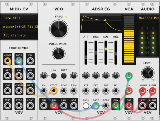 Das Bild zeigt die Module des virtuellen modularen Synthesizers (VCV Rack). Links aussen die Schnittstelle (Midi>CV) zur Klaviatur, dann der Oszillator (VCO), der Envelope Generator (ADSR EG), der Verstärker (VCA) und ganz rechts die Schnittstelle (Audio) zu den Lautsprechern des Computers. VCV Rack ist übrigens ein kostenloses Programm, ideal für den Einstieg in die modulare Synthese.